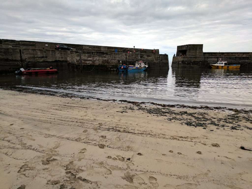 In observing and sketching these harbour scenes there is always so much going on. The harbour structures, the boats, the ropes and ladders, boat launches, steps and piers and lobster pots. The sea and sky – ever-changing in mood and colour. There are buildings, harbour houses, boat sheds, gardens and gates. There are people – walkers, fishermen, people sight-seeing or walking their dogs or taking photos. Then there are the cars and vans coming to and fro to pick up the catch of the day. Even on a quiet day there can be so much to observe and capture if you choose.